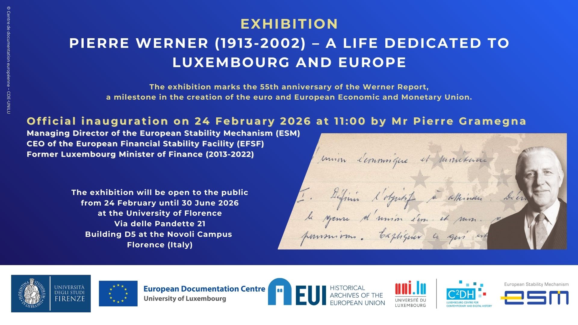 The European Documentation Centre at the University of Luxembourg (EDC-UNILU) together with its partners – the University of Florence, the Historical Archives of the European Union (HAEU) and the European Stability Mechanism (ESM) have the pleasure of inviting you to the inauguration of the exhibition: