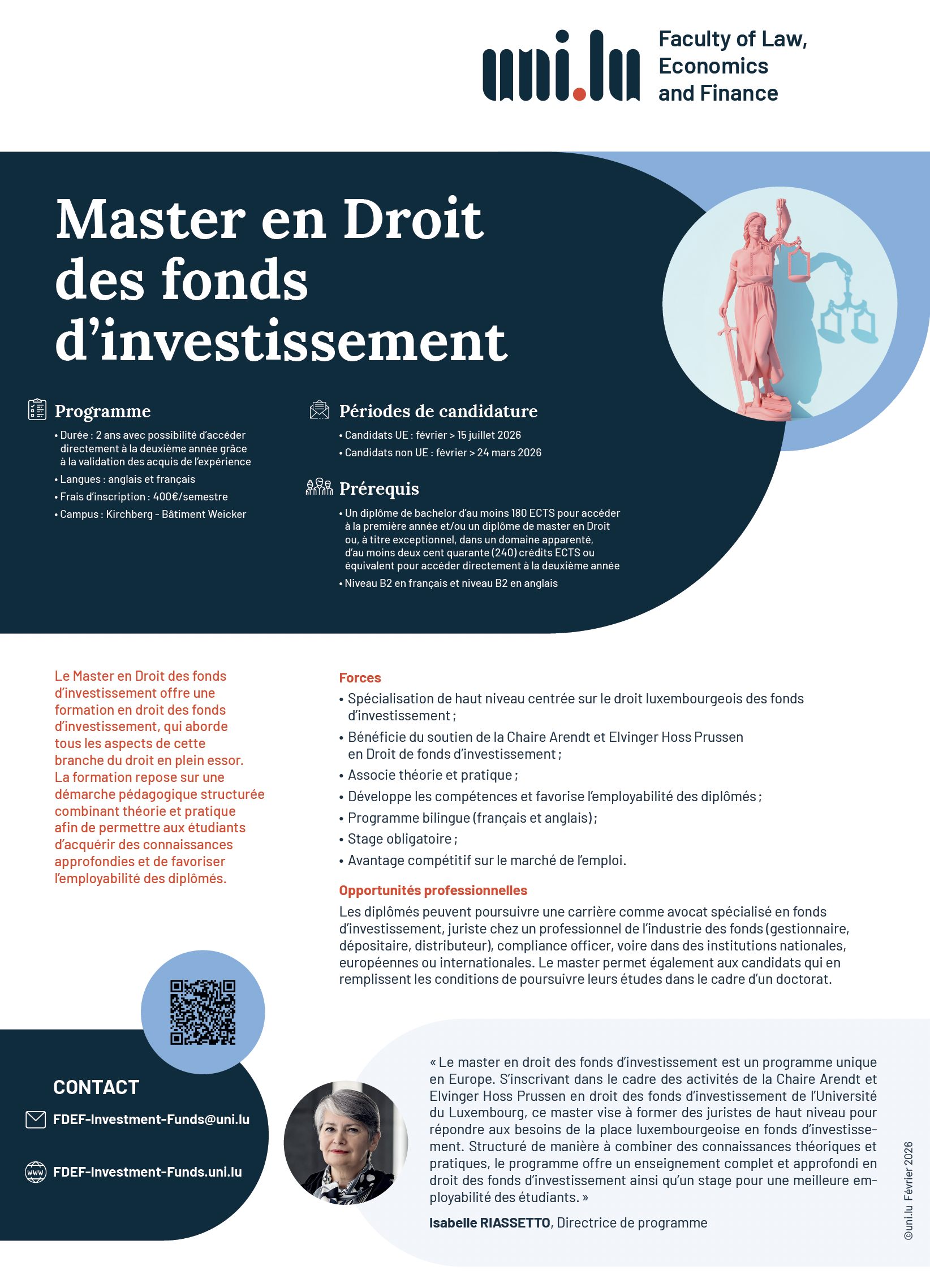 The Master in Investment Funds Law offers a programme in Luxembourg investment funds law, covering all aspects of this fast-growing area of law. The programme is based on a pedagogical approach structured to combine theory and practice enabling students to acquire deeper knowledge in the field and to enhance the employability of graduates.