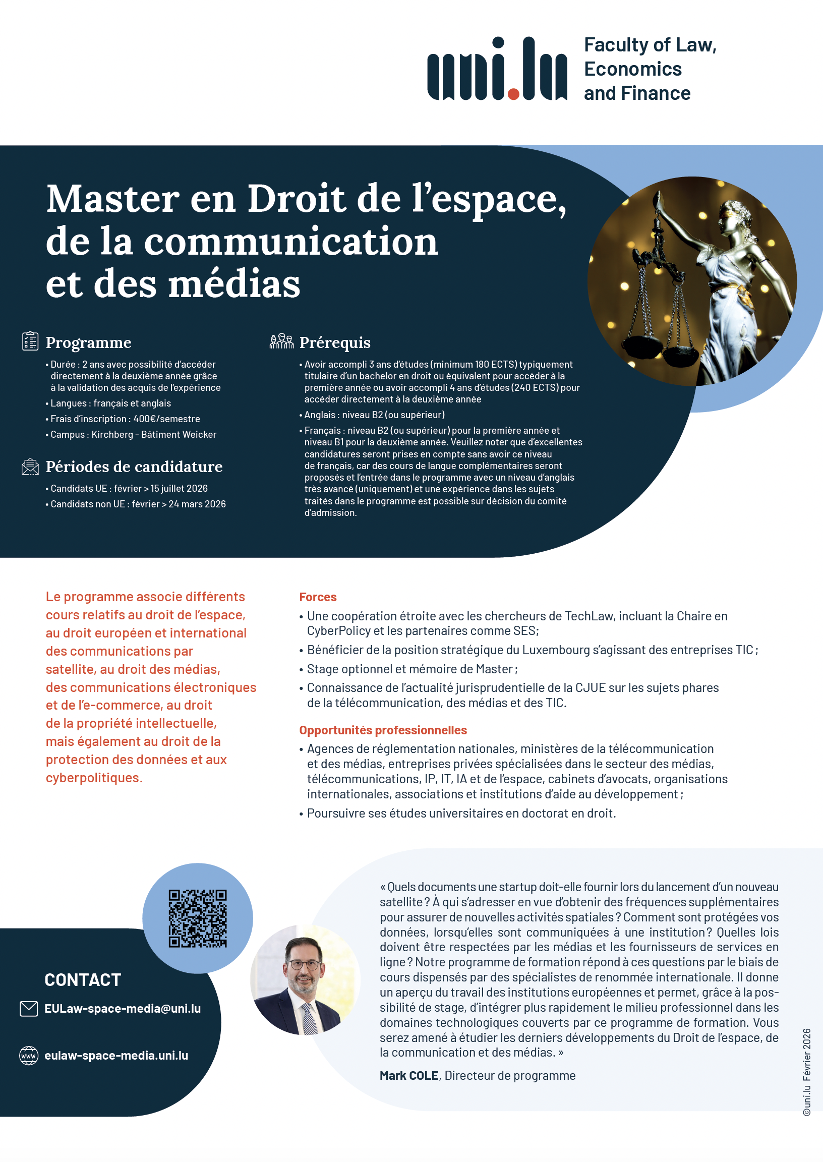 The programme combines a range of courses on space law, international and European satellite communication law, media law, electronic communications and e-commerce law, intellectual property law, as well as data protection law and cyber policies. It covers these areas on international, European and national level.