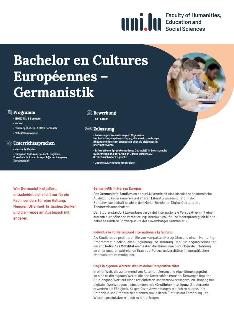 Der Bachelor en Cultures Européennes (BCE) – Germanistik richtet sich an alle, die sich intensiv mit deutscher Literatur- und Sprachwissenschaft beschäftigen und zugleich andere Fächer erkunden möchten. Es verbindet eine klassische Germanistik-Ausbildung mit interdisziplinären Einblicken in Europa und seine Kulturen.