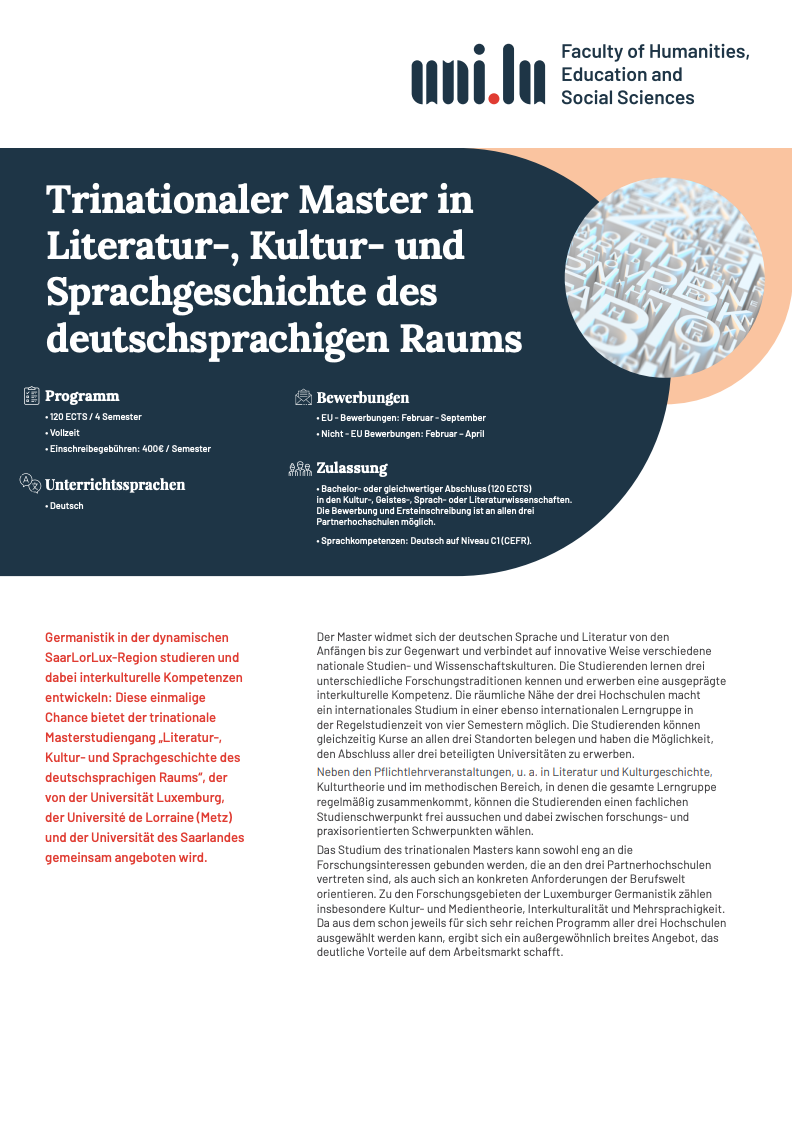 Das Programm konzentriert sich auf die deutsche Sprache und Literatur von ihren Anfängen bis zur Gegenwart. Die Studierenden wählen aus verschiedenen Kursen, die von den drei Partneruniversitäten angeboten werden, und tauchen in die unterschiedlichen akademischen Kulturen der drei Länder ein. Sie erwerben interkulturelle Kompetenzen, die in der heutigen Arbeitswelt sehr geschätzt werden.