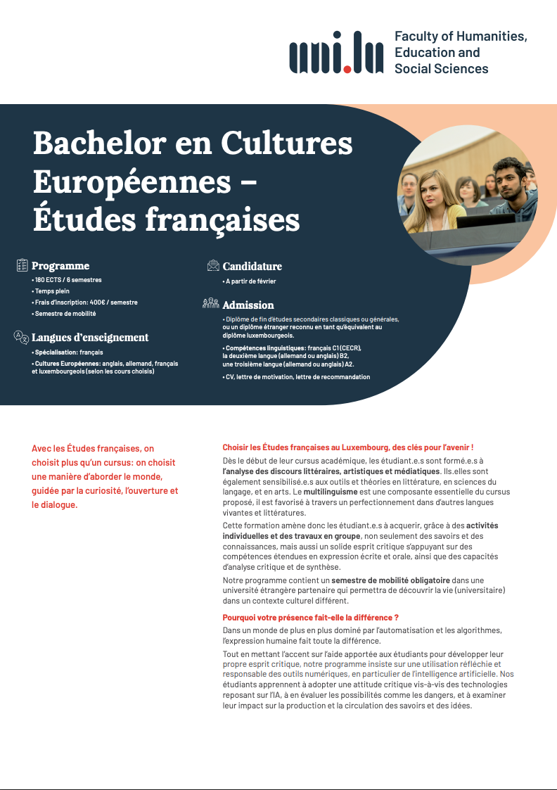 • As a graduate of our programme, you will be qualified to pursue a Master’s degree in French studies and/or other fields in the Humanities related to French linguistics and literary studies.