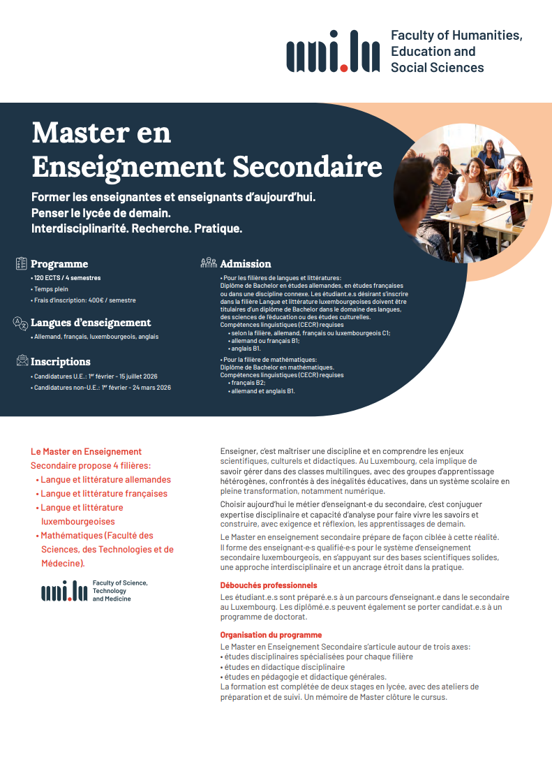 The Master in Secondary Education prepares students for a teaching career in secondary schools in Luxembourg. Students can also continue their studies at PhD level and enrol in one of the University’s doctoral schools.