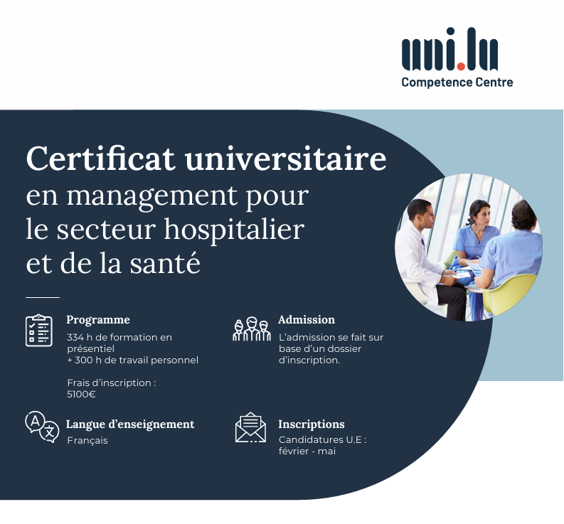 Le Certificat en management pour le secteur hospitalier et de la santé est développé en partenariat avec l’Université du Luxembourg, le Competence Centre et la FHL.