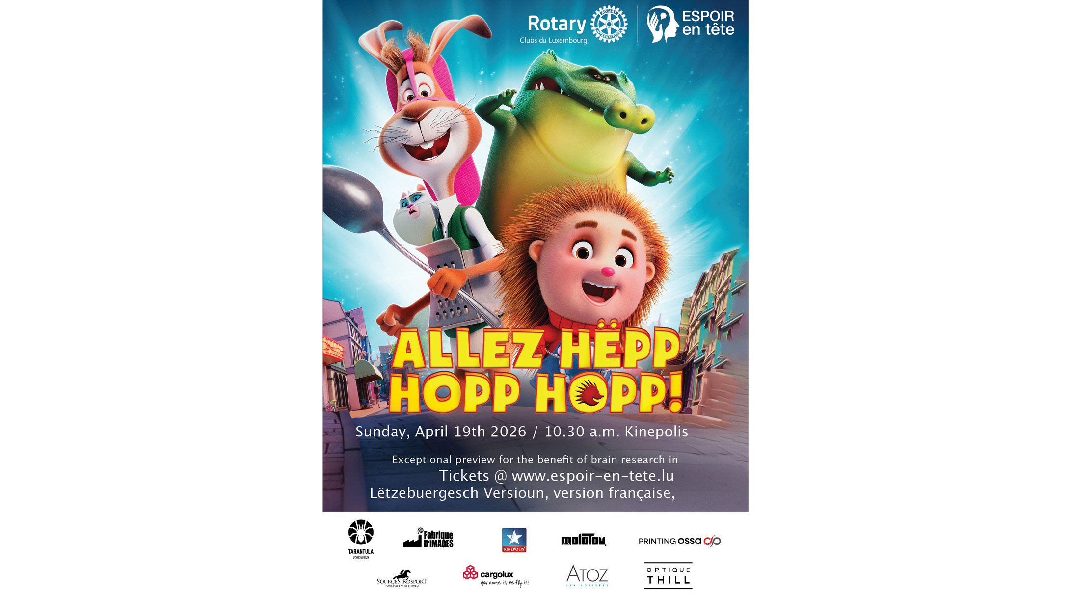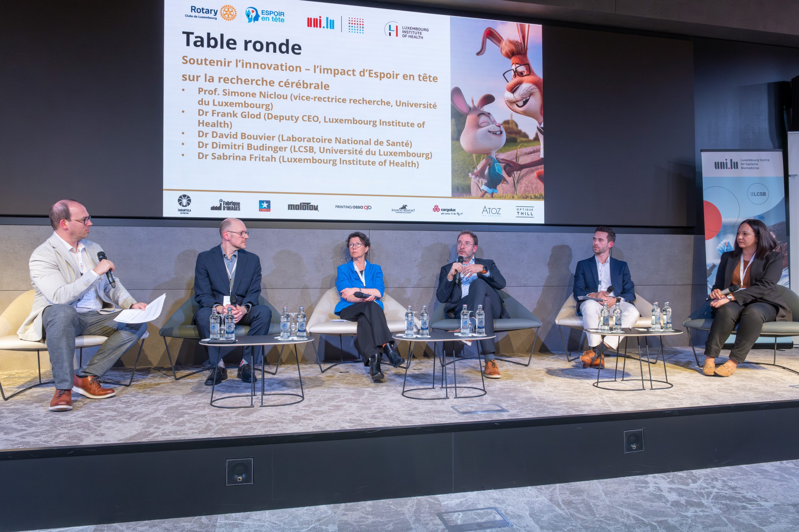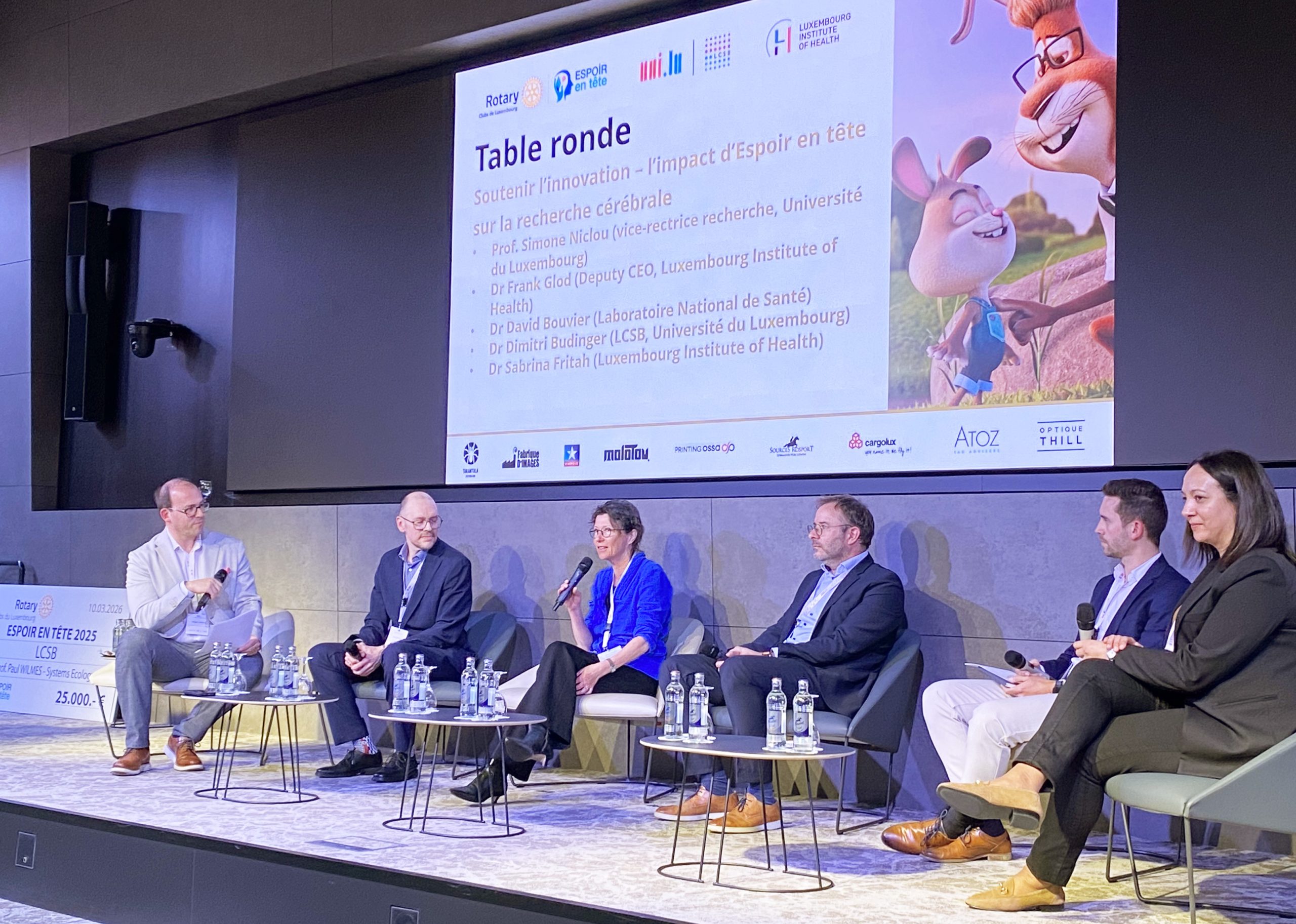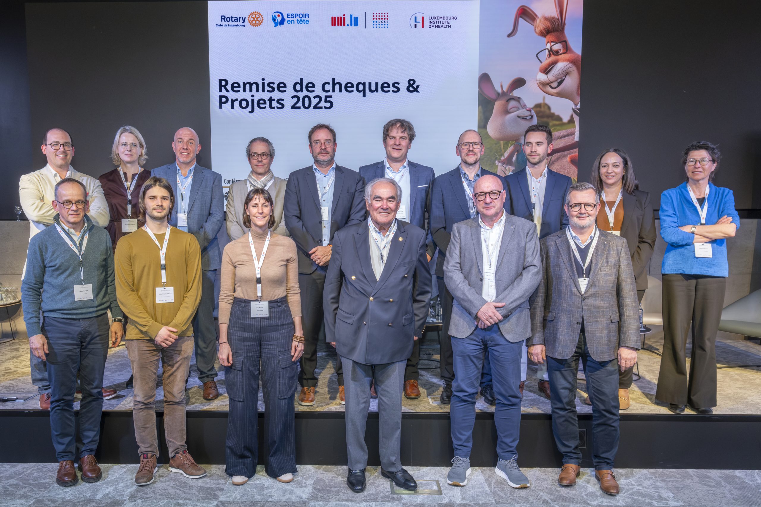 Eine eigens organisierte Veranstaltung am 10. März bot den Forschenden die Gelegenheit, ihre von „Espoir en tête“ unterstützten Projekte vorzustellen und die Wichtigkeit von Forschungsförderung zu erörtern. Siebot auch einen perfekten Anlass, um die nächste Ausgabe anzukündigen: Im Jahr 2026 wird der überwiegend in Luxemburg produzierte Animationsfilm „Allez Hëpp Hopp Hopp!” am 19. April in Kinepolis Kirchberg und Belval Premiere feiern. Für jede verkaufte Kinokarte werden 8 € für die Forschung in Luxemburg gespendet. Kaufen Sie jetzt Ihr Ticket >>