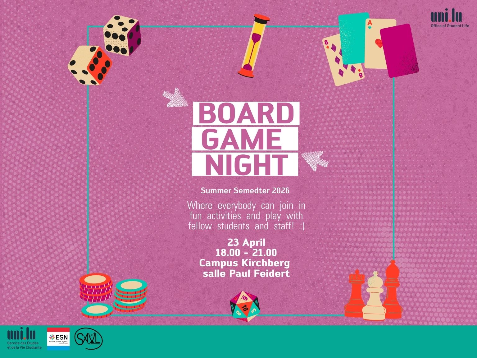 Need a break from classes or want to meet new people without pressure in a fun and relax atmosphere? Come join the Board Game Night!